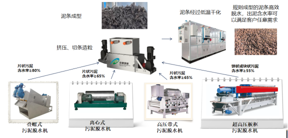 7、污泥切條是污泥烘干工藝中必不可少的關鍵環節,切條機配套低溫干化機組合應用,快速高效的對污泥進行脫水處理。