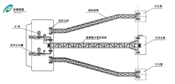 3. 輔助搖臂式浮動泵站:水位落差≤20m風(fēng)力較大,船體不適合拋錨定位的情況下,采用主輔架旋臂定位。增強了系統(tǒng)的穩(wěn)定性和適應(yīng)性。當(dāng)水位快速變化或水流沖擊力較大時,輔助搖臂可分擔(dān)部分壓力,確保輸水管與取水口的可靠連接,提高取水的穩(wěn)定性和可靠性,適用于水位落差大且水流復(fù)雜的水域。