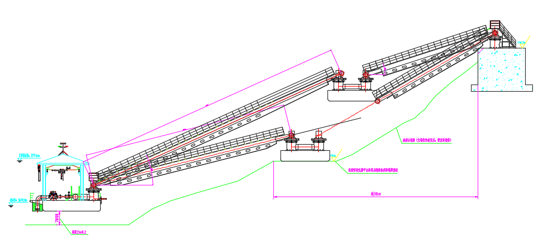 2. 高落差單級搖臂式固定泵站:適用于取水點水位落差20m~30m較大的,取水點距離岸邊支墩距離 ≤50m的,人行走道雙級懸橋式安裝場景。其特點是通過單級搖臂連接輸水管,結(jié)構(gòu)相對簡單,能適應(yīng)較大的水位變化幅度。但對搖臂的強度和穩(wěn)定性要求高,可在落差較大且水流相對平穩(wěn)的江河取水,通過調(diào)整搖臂角度,保證取水口始終處于合適水位。