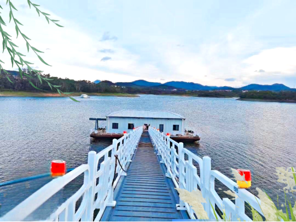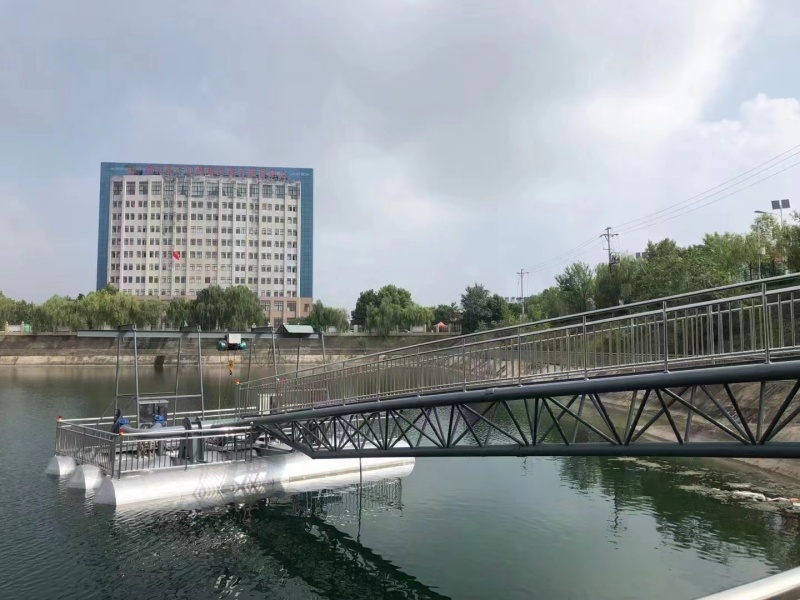 6. 浮橋式泵站:通過浮橋連接岸邊與泵站主體,輸水管鋪設(shè)在浮橋上,這種結(jié)構(gòu)穩(wěn)定性好,主要適用于水位變化頻率低,流速較慢,風(fēng)速不大,岸坡較平坦的工況。特點,浮橋可起到支撐和導(dǎo)向作用,便于輸水管的布置和維護(hù),同時也方便人員和設(shè)備在岸邊與泵站間通行。